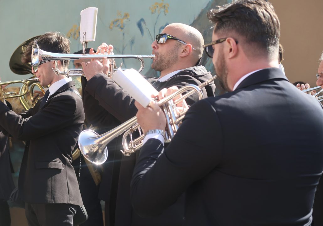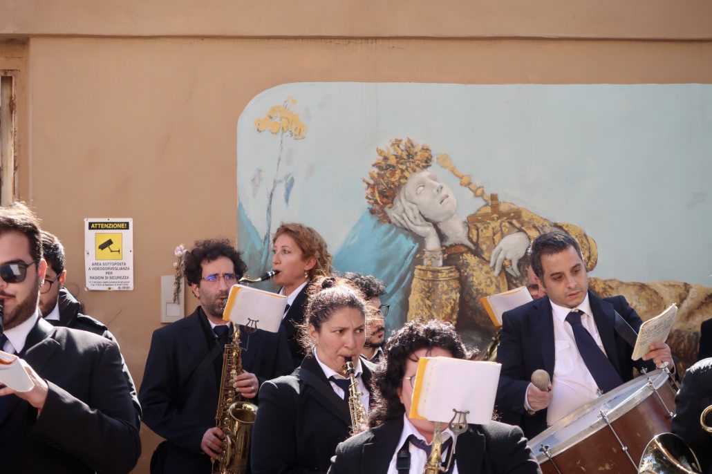 Til allersidst hejses den lille engel igen ned over den døde Jesus i kisten – dette er det store øjeblik, alle klapper og denne prægtige kiste bæres nu gennem gaderne i Albergheria med musikerne forrest..og bare rolig, den lille engel kom op og ned i god behold…..