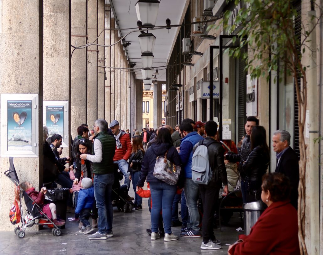 Det slår mig, at der er så mange mennesker på pladser og i arkader, og især at mange af dem står. De er ikke på vej. De er ikke på nettet – eller rettere i nettet! De står i en samtale. De står i forventning for at få noget sødt. De er, hvor de er.
